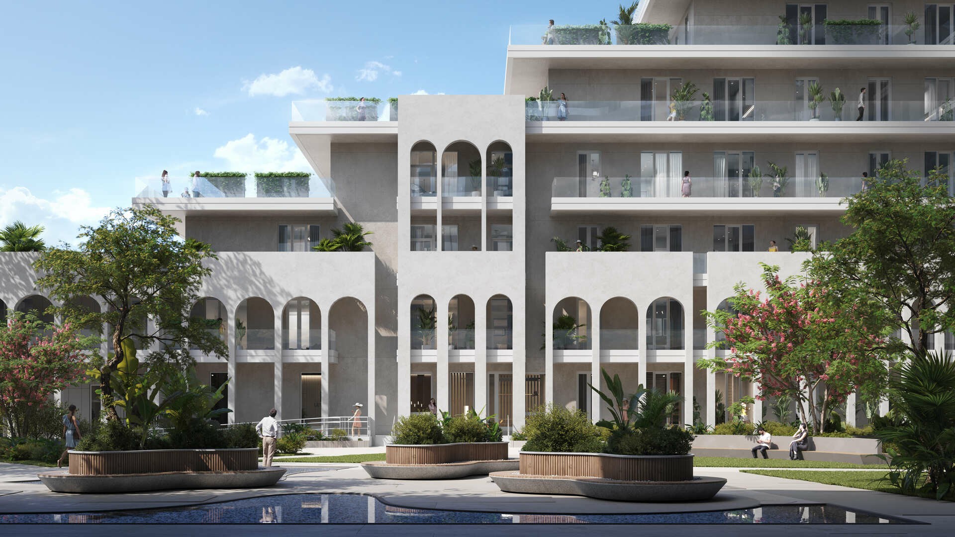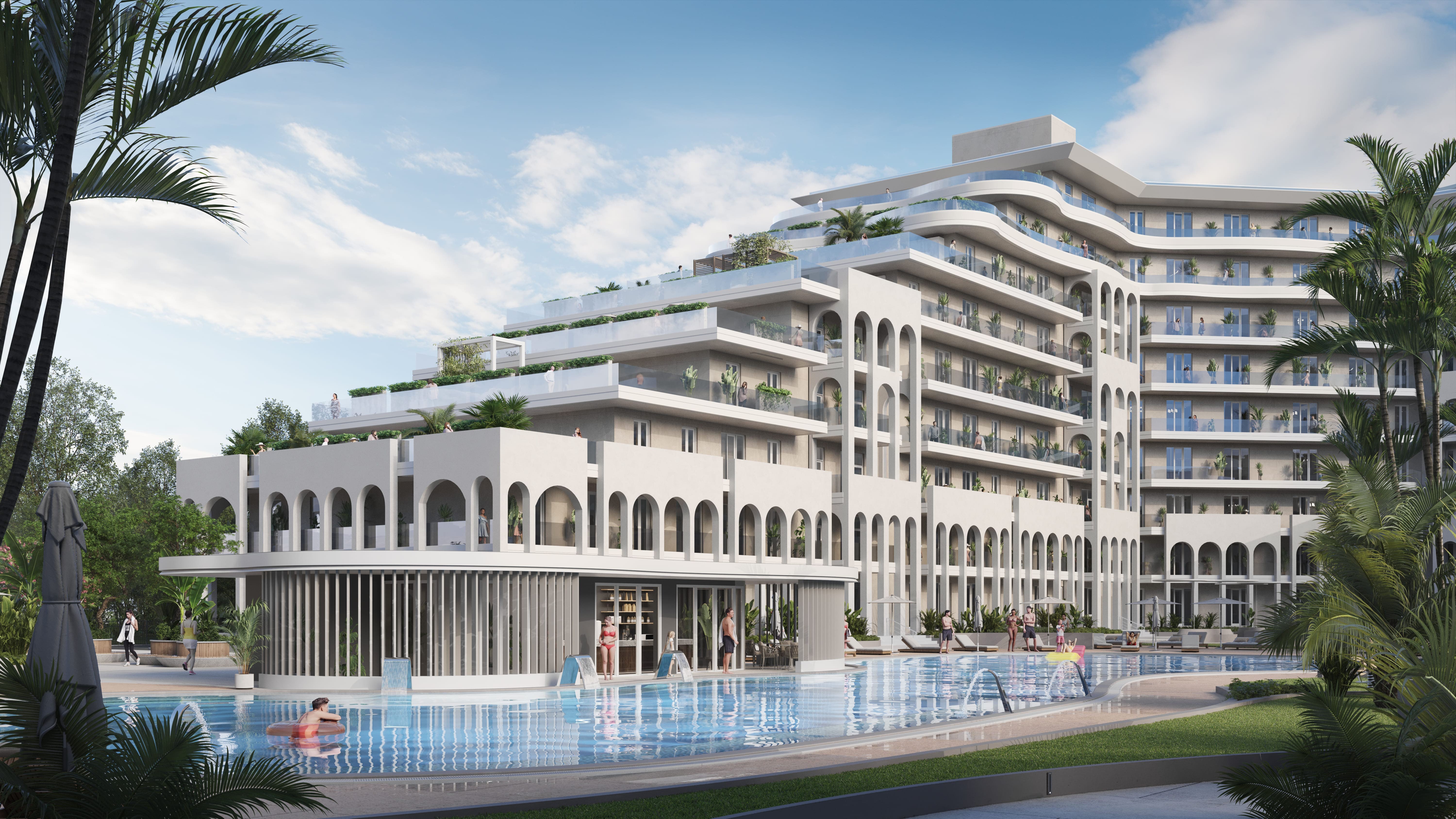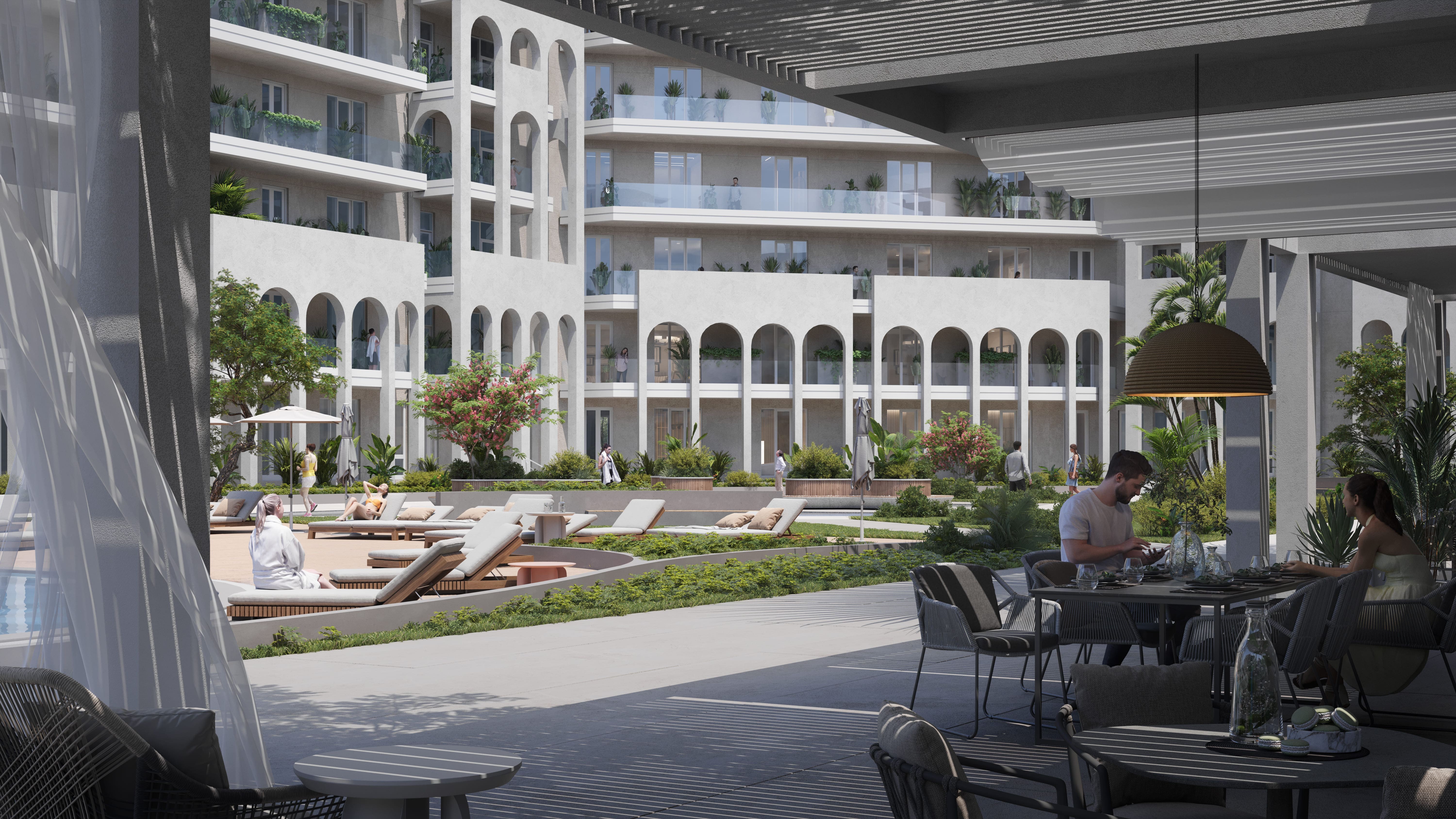 • На территории комплекса находятся четыре девятиэтажных каскадных здания, выполненных в светлых тонах с использованием стекла и персидского камня. Фасады опоясаны колоннадами, увенчанными арочными сводами — эти архитектурные формы ведут свою родословную от античных палаццо и терм.