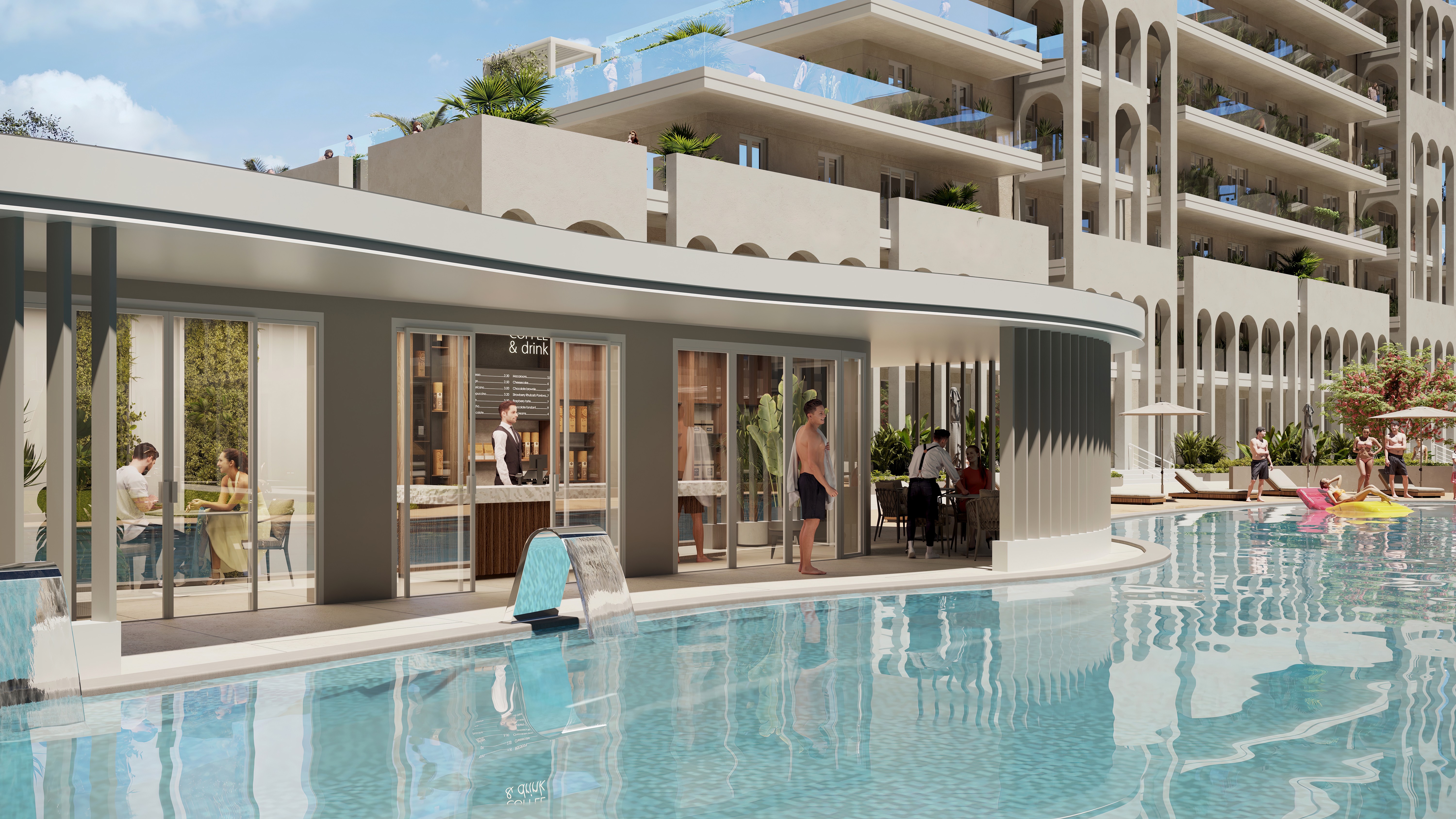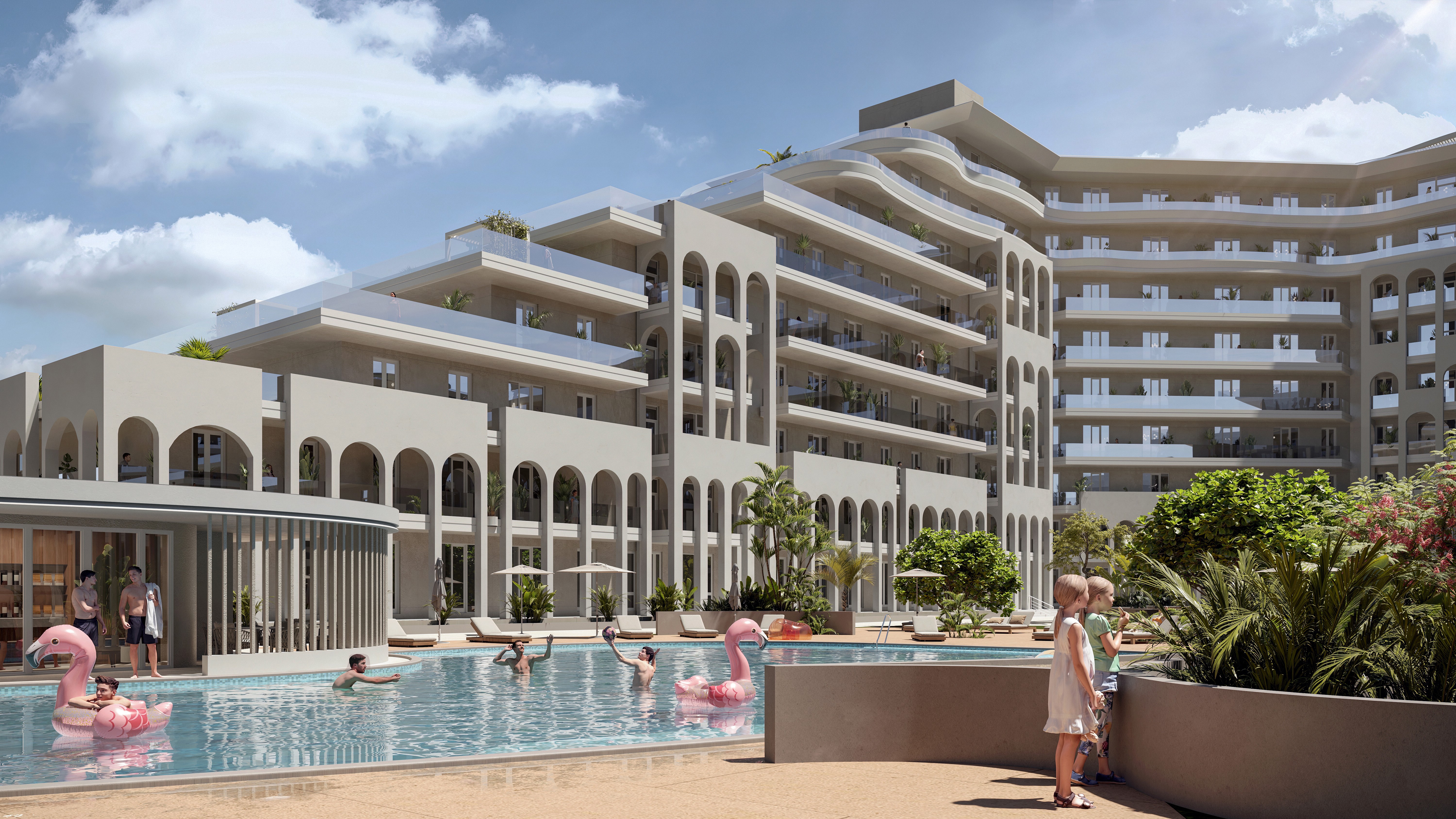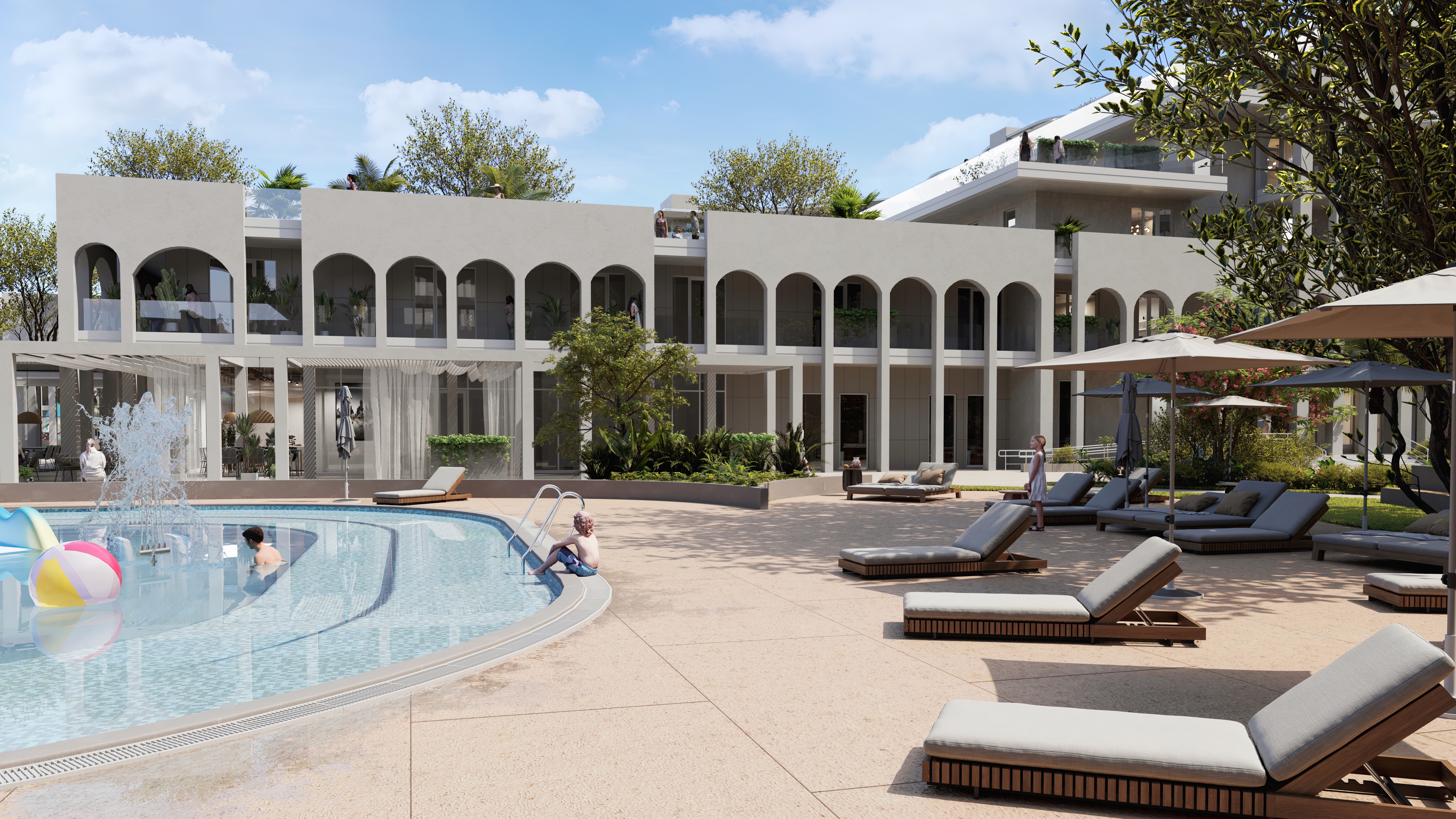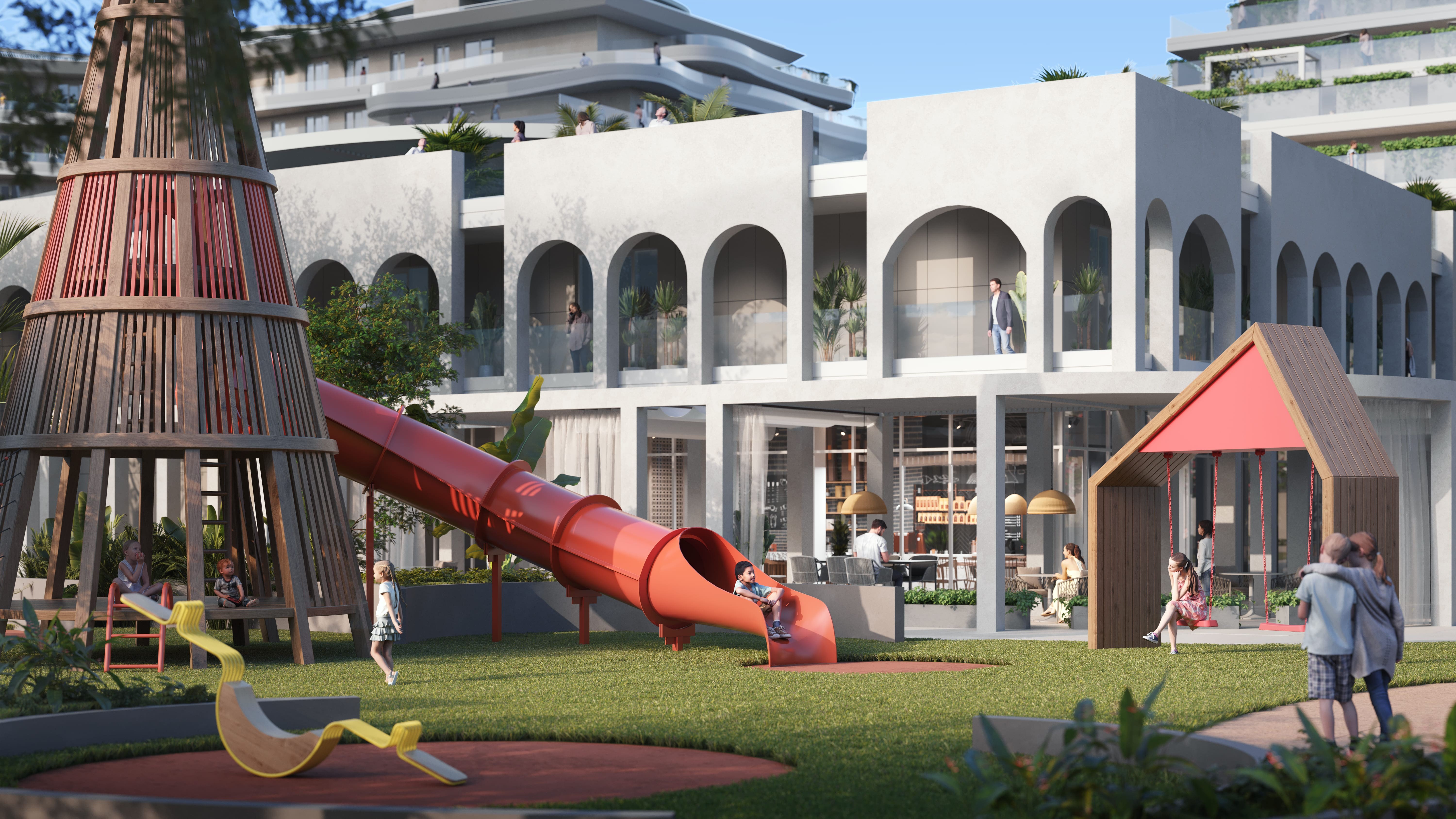 • На территории комплекса находятся четыре девятиэтажных каскадных здания, выполненных в светлых тонах с использованием стекла и персидского камня. Фасады опоясаны колоннадами, увенчанными арочными сводами — эти архитектурные формы ведут свою родословную от античных палаццо и терм.