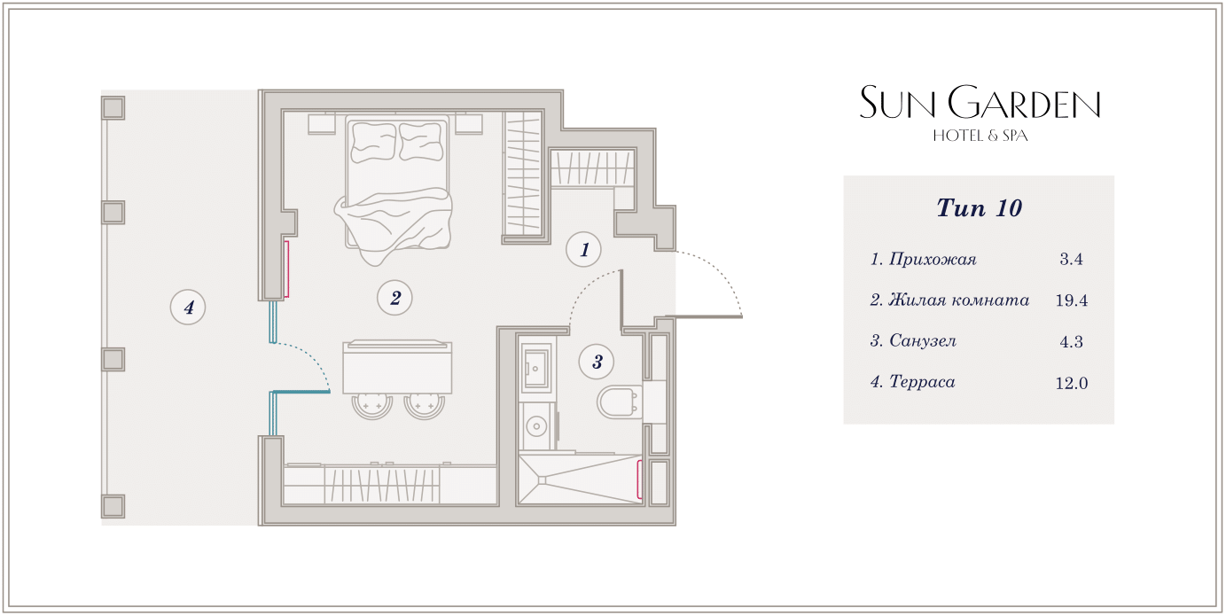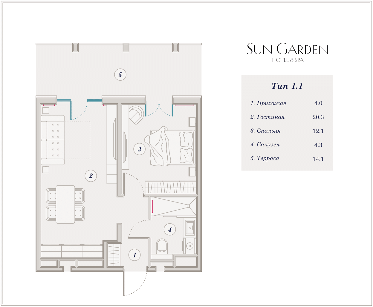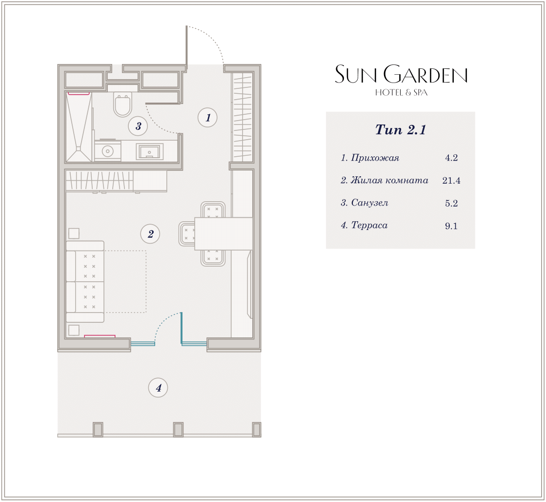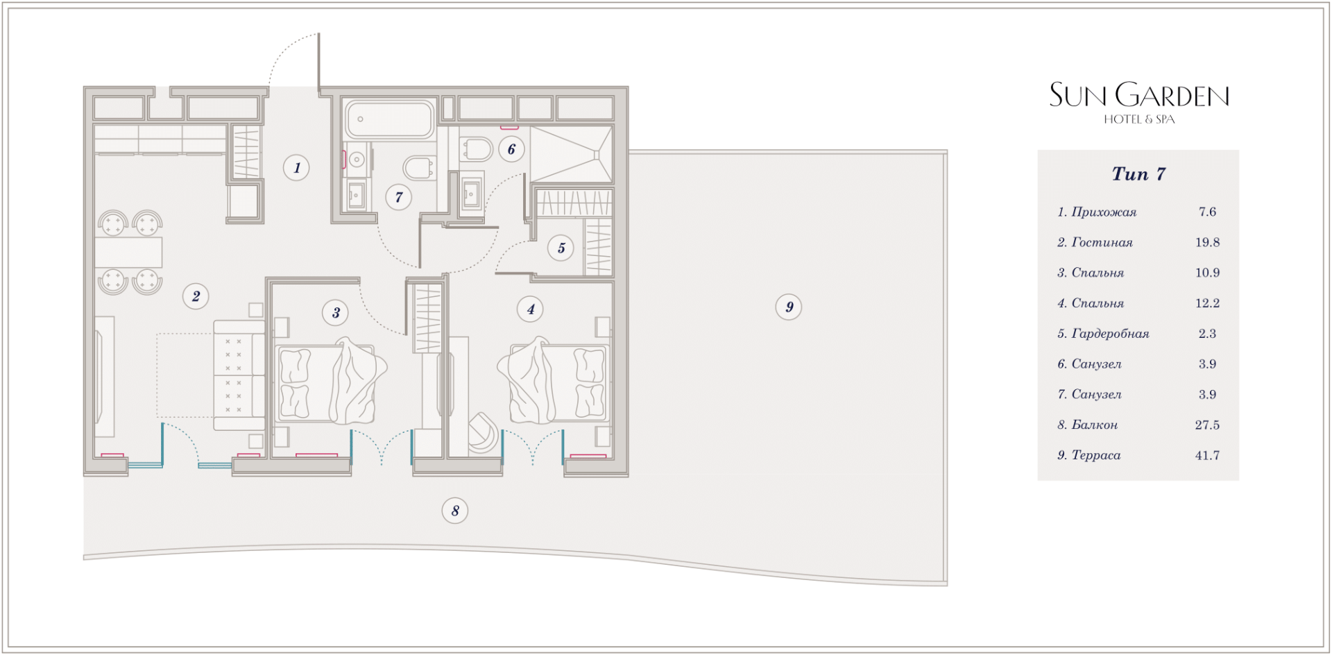 • Приобретая номер в Sun Garden Hotel & Spa, вы инвестируете в будущее, ведь это не только комфортное место для жизни и отдыха, но и перспективное вложение с потенциалом роста стоимости.