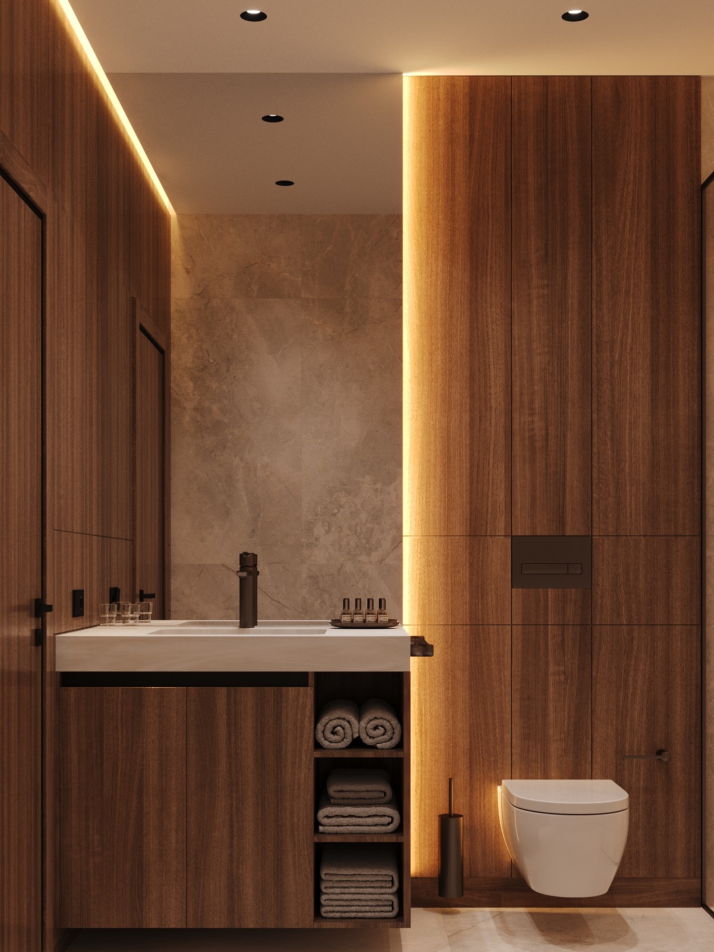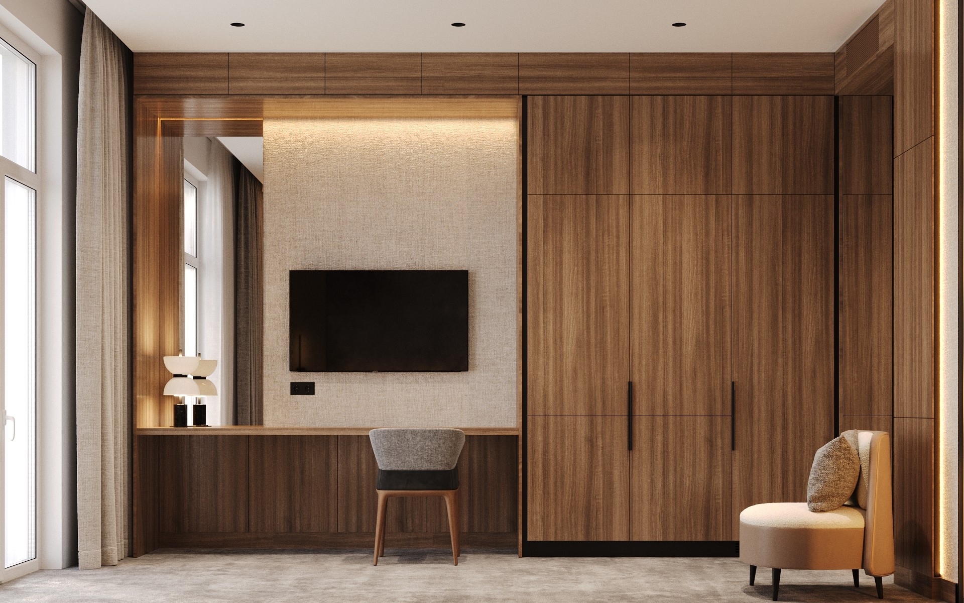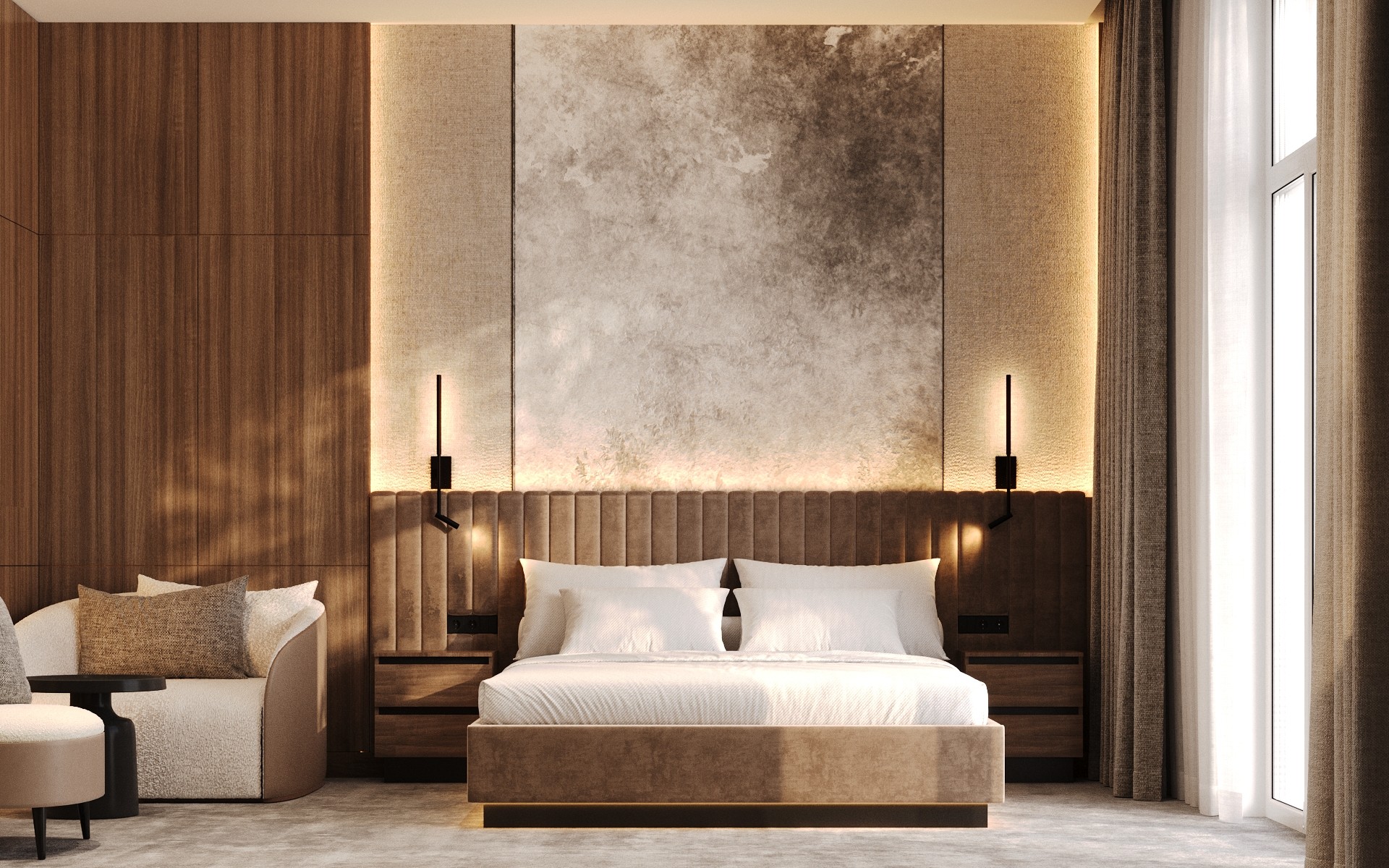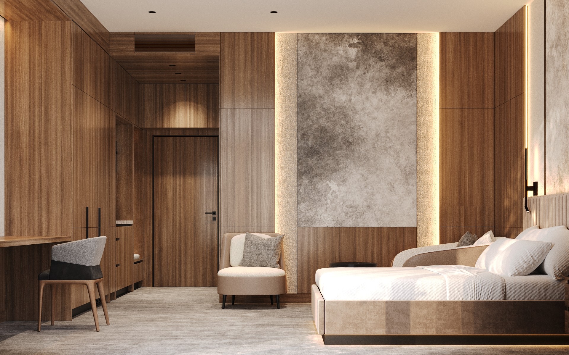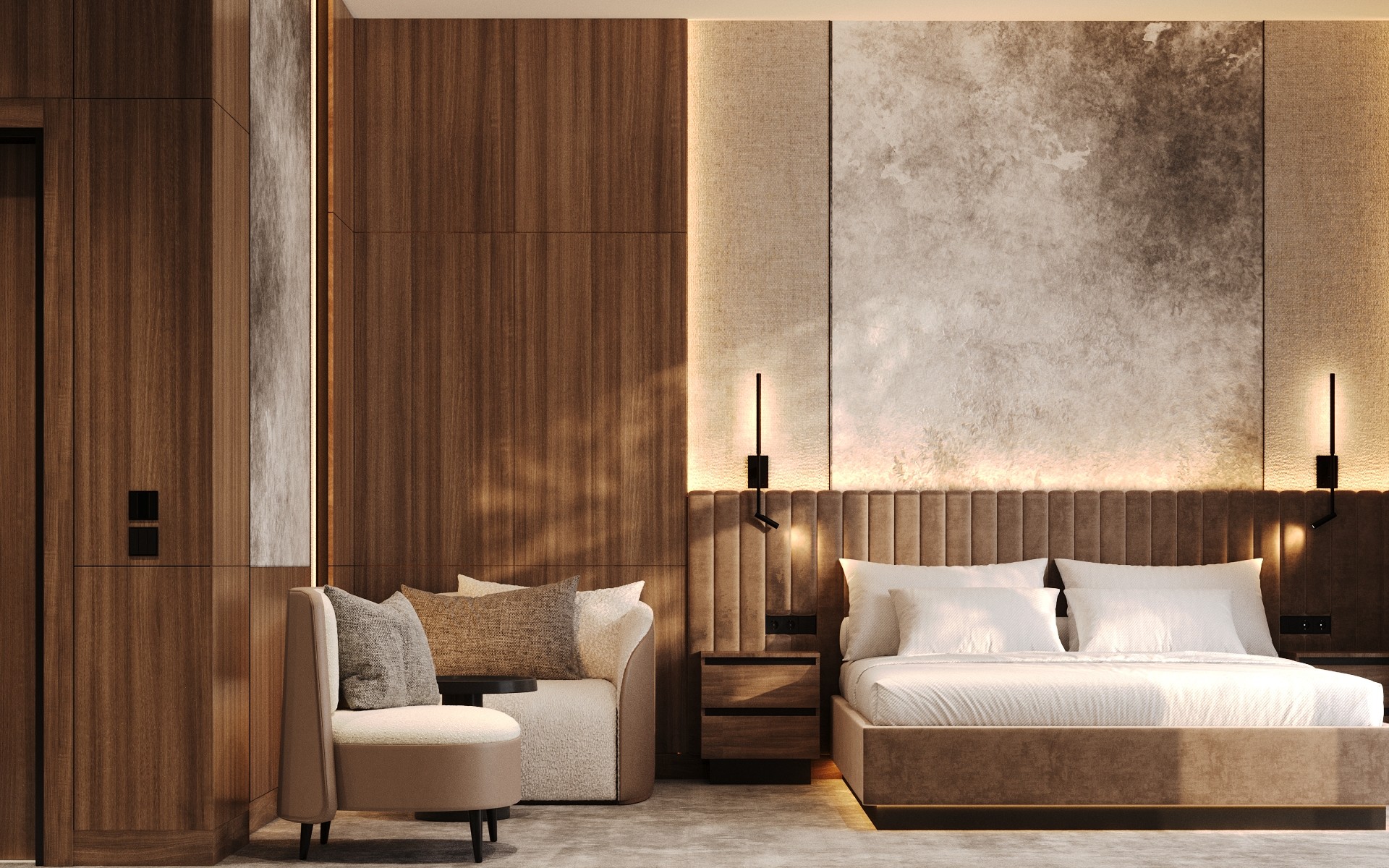 • Дизайн интерьеров номеров сочетает в себе безупречный стиль и функциональность. Каждая деталь здесь тщательно подобрана и формирует единую гармоничную среду. В цветовой палитре — спокойные и нежные оттенки, создающие умиротворенную атмосферу.
